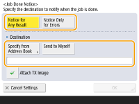 To select the destination to notify from <Address Book>, it is necessary to register the destination in advance. Registering Destinations in the Address Book To select <Send to Myself> as the destination to notify, it is necessary to register your e-mail address in the user information in advance, and log in using personal authentication management. Registering User Information in the Local Device |