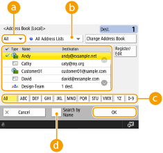 Address list drop-down listEnables you to display a specific group of destinations. When you are logged in to the machine with personal authentication management, selecting <Personal Addr. List> displays your personal Address Book.