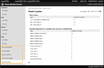 You can check a variety of information about the machine, such as error information, the amount of remaining paper and toner, information about attached optional equipment, and the total number of pages that have been printed up to now.
