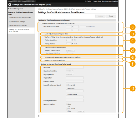 [Enable Timer for Certificate Issuance Auto Request]Select this to automatically request a certificate to be issued at a specified time, and specify the start date/time in [Request Start Date/Time:].