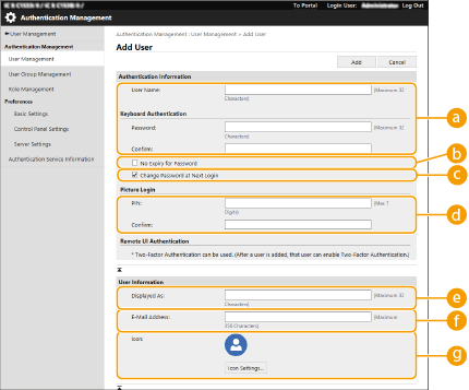 Configuring settings via the control panelYou can also register user information by pressing  (Settings/Register)  <Management Settings>  <User Management>  <Authentication Management>  <Register/Edit Authentication User>. <Register/Edit Authentication User>Creating user groupsAddress Lists in the Address Book can be shared between users who are registered in a user group. Registering User Groups |