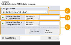 <Encryption Level>Select the encryption level. If you want to use <Acrobat 9.0 or Equivalent/256-bit AES> rather than <Acrobat 10.0 or Equivalent/256-bit AES> as the encryption level, use this setting to change the selections you can make.