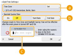 If you changed the setting of <Time Zone> or <Daylight Saving Time>, you need to restart the machine by turning the power OFF. Press the power switch to turn OFF the machine ( Turning OFF the Machine). When 10 or more seconds have elapsed after the touch panel display and indicators turned off, turn ON the machine again ( Turning ON the Machine). |