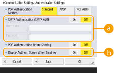 1 | Specify each item. ![]() <POP Authentication Method>Set the authentication methods of the POP3 server. To encode the password during authentication, select <APOP>. To authenticate users when receiving mail (POP), select <POP AUTH>. <POP Authentication Before Sending>To perform authentication using the POP3 server, press <On>. |