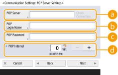 3 | Specify the POP server settings. ![]() <POP Server>Enter a POP3 server name (or an IP address). After specifying the settings, check the connection for <POP Server>. <POP Login Name>To use a POP3 server, enter the user name of the specified mail account using alphanumeric characters. <POP Password>To use a POP3 server, enter the password of the specified mail account. ![]() When [POP Password] is specified on the Remote UI, if you want to change and register the server address in [POP Server], entering the password in [POP Password] is required. <POP Interval>You can set the interval to automatically issue POP in minutes. |