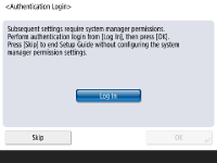 Make an authenticated login to configure the settings that require Administrator privileges. ![]() ![]() Press <Log In>, select a user with administrator privileges and enter the password using the numeric keys on the control panel. The default password for "Administrator" is "7654321". Press <Log In> again, and press <OK>. If you enter the factory default password, the screen prompting you to change the password is displayed. You can also change the password later. Logging in as an Administrator You can skip the settings that require Administrator privileges and proceed to the next step by pressing <Skip>. In this case, proceed to Step 10. | |