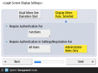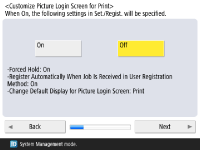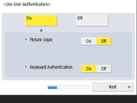 To enhance the security of the machine, use the machine under a system that uses user authentication. ![]() This machine is set to use the user authentication as the login service. For more information, see Configuring the Personal Authentication Management Settings. ![]() Press <On> for <Use User Authentication>, press <On> for the login method to use, and press <Next>. If you do not use user authentication, press <Off> for <Use User Authentication>, press <OK>, and proceed to Step 5. ![]() Specify the following settings if there are no administrators besides the "Administrator" user registered in the machine. ![]() To enhance the security of the machine by disabling the "Administrator" user and registering a new administrator, press <Yes>. In Register Administrator, enter <User Name> and <Password>, and press <OK>. Specify <E-Mail Address>, <Department ID>, and <Display Name> as necessary. For more information, see Registering User Information in the Local Device. The "Administrator" user will be disabled the next time you log in. To operate as "Administrator," press <No>. ![]() ![]() Select the timing for displaying the login screen. If you select <Display When Func. Selected>, press <Functions>, select the function to display the login screen for, and press <OK>. Also, select the setting items on the <Settings/Registration> screen to display the login screen for. If you select <Off> for <Picture Login> and <Keyboard Authentication>, press <OK>. Proceed to step 5. If you select <On> for <Picture Login> or <Keyboard Authentication>, press <Next>. ![]() ![]() To use authentication via numeric key entry only on the login screen, press <On>. If you select <Off> for <Picture Login>, press <OK>. Proceed to step 5. If you select <On> for <Picture Login>, press <Next>. ![]() ![]() Set whether to require users to enter a PIN or pattern when using Picture Login, and press <Next>. ![]() ![]() When you want to use Picture Login with the machine being in an appropriate condition for the print function, press <On>. This setting enables the following: use the Forced Hold Printing function, utilize print data sent from a computer for user registration, and display by default an appropriate login screen for each individual user when that user operates the machine for printing. For more information, see Configuring the Forced Hold Printing Settings, <User Registration Method>, and <Change Default Display for Picture Login Screen>. ![]() ![]() Select the number of preset buttons on the Picture Login screen, and press <OK>. | |