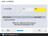 Specify the settings for network connection. ![]() ![]() Press <On> for <Use IPv4> or <Use IPv6>, and press <Next>. You can also use both IPv4 and IPv6. If you press <Off> for <Use IPv4> and <Use IPv6>, and press <OK>, skip the network settings and proceed to Step 9. ![]() If you press <On> for <Use IPv4>, specify the following settings. ![]() To obtain the IP address automatically, press <DHCP> or <Auto IP>, and press <Next> or <OK>. To set the IP address manually, clear the selection for <DHCP> or <Auto IP>, press <IP Address>, <Subnet Mask>, and <Gateway Address> to enter each value, and press <Next> or <OK>. For information on the IPV4 address settings, see Setting an IPv4 Address. ![]() If you press <On> for <Use IPv6>, specify the following settings. ![]() Press <On> to use the stateless address or <Off> to not use the stateless address, and press <Next>. For information on the IPv6 address, see Setting an IPv6 Address. ![]() After specifying the stateless address, specify the following settings. ![]() Press <On> to use the manual address or <Off> no not use the manual address, and press <Next>. To use the manual address, press <Manual Address>, <Prefix Length>, and <Default Router Address> to enter each value. ![]() After specifying the manual address, specify the following settings. ![]() Press <On> to use DHCPv6 or <Off> to not use DHCPv6, and press <OK>. | |