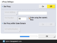 Specify the necessary settings to use the Proxy. ![]() ![]() To use the Proxy, press <On>, press <Server Address> and <Port Number> to enter each value, and press <OK>. If you set <Use Proxy within Same Domain> to <On>, press <Set Authentication> to specify the Proxy authentication settings. For information on the Proxy settings, see Setting a Proxy. | |