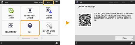 By pressing <Help>, a QR code is displayed. By scanning this QR code with a mobile device such as smartphone or tablet, you can access the User's Guide page for this machine.