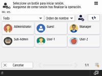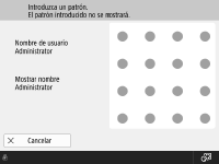 ![]() | Pulse su nombre de usuario. Si se hubiera configurado un código PIN, siga las instrucciones de la pantalla para introducir el código PIN y, a continuación, pulse <Iniciar sesión>. ![]() Si fuera necesaria la introducción de un patrón, siga las instrucciones que aparecen en la pantalla para introducir el patrón. ![]() |