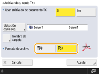 No puede realizar un Envío directo si establece <Archivar documento TX> en <Sí> Esta opción cambia automáticamente a <No> en los siguientes casos. Especifique el destino de nuevo o vuelva a poner la opción en <Sí> según corresponda. Cuando el destino de la copia de seguridad se ha eliminado de la libreta de direcciones Cuando se ha importado una libreta de direcciones desde la IU remota Importación/exportación de datos de configuración Cuando se ha recibido una libreta de direcciones desde el software de administración de libretas de direcciones <Importar/Exportar desde software gestión libr. direcc,> |