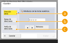 <Prefijo de direcciones>1 | Seleccione el método de entrada de direcciones IP e introduzca las excepciones de direcciones. |