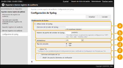 Seleccione [Utilizar Enviar de Syslog], y especifique las opciones necesarias.