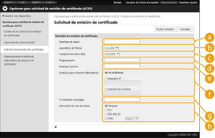 Puede enviarse una solicitud para emitir el certificado necesario para las claves generadas con el equipo a un servidor SCEP (Protocolo de inscripción de certificado simple) que gestione los certificados. Los certificados emitidos desde un servidor SCEP se registran automáticamente en el equipo. Se requieren privilegios de Administrator para enviar una solicitud para emitir un certificado.