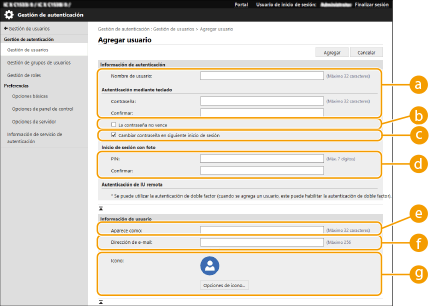 [Cambiar contraseña en siguiente inicio de sesión]Seleccione esta casilla de verificación para obligar a los usuarios registrados a cambiar de contraseña la primera vez que inicien sesión. Cuando el usuario cambie la contraseña, la casilla se desmarcará automáticamente.