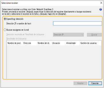 Haga clic en [Especificar dirección] e introduzca la dirección IP o el nombre de host del equipo en el cuadro de texto [Dirección IP o nombre de host].