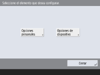 Cuando la Autenticación de usuario (Administración de usuarios) esté activada, <Opciones personales> y se muestren <Opciones de dispositivo> en la pantalla tras iniciar sesión con privilegios de Administrador al pulsar  (Config./Guardar). Si selecciona <Opciones personales> y cambia los elementos que pueden personalizarse, las opciones se registrarán como las opciones personales para el usuario que ha iniciado sesión en el equipo (Lista de elementos que se pueden personalizar). Si selecciona <Opciones de dispositivo>, las opciones se registrarán como las opciones del equipo. Si inicia sesión como un usuario sin privilegios de Administrador, como ocurre al seleccionar <Opciones personales>, si cambia las opciones que pueden personalizarse, las opciones quedarán registradas como opciones personales sin ser registradas como opciones del dispositivo.
