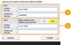 Para establecer el mismo nombre de host y nombre de dominio que para IPv4, pulse <Sí> en <Mismo nombre host/dominio que para IPv4>. Para establecer una configuración distinta de IPv4, pulse <No>.