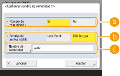 Para cada comunidad, seleccione los privilegios de acceso de MIB de <Lect./Escrit.> o <Sólo lectura>.