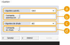 Para establecer una combinación de autenticación y codificación, seleccione <Autent. sí/Cifrado sí>, <Autent. sí/Cifrado no> o <Autent. no/Cifrado no>.