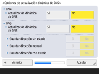 Especifique la dirección del servidor DNS, el nombre del host DNS y el nombre del dominio DNS. ![]() ![]() Pulse <Servidor DNS primario> y <Servidor DNS secundario>, introduzca la dirección IPV4/IPv6 para el servidor DNS y pulse <Siguiente>. Para obtener información sobre las opciones de la dirección del servidor DNS, consulte Configuración de las opciones de DNS. ![]() ![]() Pulse <Nombre de host> para introducir el nombre del equipo (nombre de host). Pulse <Nombre de dominio> para introducir el nombre de dominio al que pertenece el equipo, y pulse <Siguiente>. Si las opciones de IPv4 y IPv6 son iguales, pulse <Sí> para <Mismo nombre host/dominio que para IPv4>. ![]() ![]() Para actualizar automáticamente mediante las Opciones de actualización dinámica de DNS, pulse <Sí> para <Actualización dinámica de DNS>, y pulse <Aceptar>. Si configura <Actualización dinámica de DNS> para <IPv6> como <Sí>, seleccione <Sí> para registrar los elementos automáticamente. | |