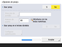 Especifique las opciones necesarias para utilizar el proxy. ![]() ![]() Para utilizar el proxy, pulse <Sí>, pulse <Dirección de servidor> y <Número de puerto> para introducir cada valor, y luego pulse <Aceptar>. Si configura <Usar proxy en el mismo dominio> como <Sí>, pulse <Configurar autenticación> para especificar las opciones de autenticación del proxy. Para obtener información sobre las opciones del proxy, consulte Configuración de un proxy. | |