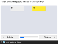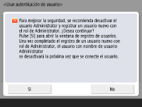 Para aumentar la seguridad del equipo, utilícelo en un sistema que emplee autenticación de usuario. ![]() Este equipo está configurado para emplear la autenticación de usuario como servicio de inicio de sesión. Para obtener más información, consulte Configuración de las opciones de administración de autenticación personal. ![]() Pulse <Sí> para <Usar autenticación de usuario>, pulse <Sí> para el método de inicio de sesión que se va a utilizar y pulse <Siguiente>. Si no emplea la autenticación de usuario, pulse <No> para <Usar autenticación de usuario>, pulse <Aceptar> y continúe al Paso 5. ![]() Indique las opciones siguientes si no hay administradores aparte del usuario "Administrador" registrado en el equipo. ![]() Si desea mejorar la seguridad del equipo deshabilitando el usuario "Administrador" y registrando un nuevo administrador, pulse <Sí>. En Registrar Administrator, introduzca <Nombre de usuario> y <Contraseña>, y pulse <Aceptar>. Especifique <Dirección de e-mail>, <ID dpto.> y <Mostrar nombre> según sea necesario. Para obtener más información, consulte Registro de la información de usuario en el dispositivo local. El usuario "Administrador" estará desactivado la próxima vez que inicie sesión. Para actuar como "Administrador", pulse <No>. ![]() ![]() Seleccione el momento en que desea mostrar la pantalla de inicio de sesión. Si selecciona <Mostrar si selecciona func.>, pulse <Funciones>, seleccione la función de la que desea mostrar la pantalla de inicio de sesión y pulse <Bien>. Seleccione también los elementos de configuración de la pantalla <Configuración> de los que desea que se muestre la pantalla de inicio de sesión. Si selecciona <No> para <Inicio de sesión con foto> y <Autenticación mediante teclado>, pulse <Aceptar>. Proceda con el paso 5. Si selecciona <Sí> for <Inicio de sesión con foto> o <Autenticación mediante teclado>, pulse <Siguiente>. ![]() ![]() Para utilizar autenticación a través de la entrada mediante las teclas numéricas únicamente en la pantalla de inicio de sesión, pulse <Sí>. Si selecciona <No> para <Inicio de sesión con foto>, pulse <Aceptar>. Diríjase al paso 5. Si selecciona <Sí> para <Inicio de sesión con foto>, pulse <Siguiente>. ![]() ![]() Configure si se requerirá a los usuarios introducir un PIN o patrón cuando se utilice Acceso por imagen, y pulse <Siguiente>. ![]() ![]() Cuando desee utilizar Acceso por imagen con el equipo en unas condiciones apropiadas para la función de impresión, pulse <Sí>. Esta opción permite lo siguiente: usar la función de Impresión retenida forzada, utilizar datos de impresión enviados desde un ordenador para registro del usuario y mostrar de forma predeterminada una pantalla de inicio de sesión apropiada para cada usuario individual cuando dicho usuario utilice el equipo para imprimir. Para obtener más información, consulte Configuración de las opciones de impresión retenida forzada, <Método de registro de usuarios> y <Cambiar vista prefij. pantalla inicio de sesión con foto>. ![]() ![]() Seleccione el número de botones preestablecidos en la pantalla de Acceso por imagen y pulse <Aceptar>. | |