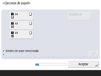 Compruebe que el papel cargado en los casetes está bien especificado. ![]() ![]() Si los tamaños del papel son correctos, pulse <Aceptar>. Para obtener información en pantalla e instrucciones sobre cómo cambiar las opciones, consulte Especificación del tamaño y el tipo del papel en el casete. Si no ha iniciado sesión como administrador, continúe con el paso 10. | |