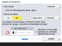 Especifique la fecha y la hora del equipo. ![]() ![]() Introduzca la fecha y la hora, y pulse <Aceptar>. Configure <Zona horaria> y <Horario de verano> según proceda. Para obtener más información, consulte Configuración de la fecha/hora. | |