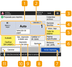 Muestra el estado de configuración, como el tamaño de papel para imprimir y el número de impresiones. Recuerde confirmar las opciones para imprimir correctamente. Para cambiar las opciones, pulse el botón que hay debajo de la sección mostrada. Para cambiar el número de impresiones, introduzca el número mediante las teclas numéricas.