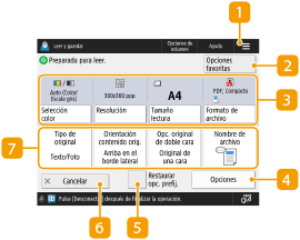 Al pulsar <Leer y guardar> en la pantalla de <Inicio> y, a continuación, pulsar <Red> o <Dispositivo de memoria> para leer los originales, aparece la pantalla de configuración siguiente.