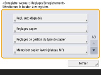 Si <Raccourci Réglages/Enreg.> ne s'affiche pas sur l'écran <Accueil>, appuyez sur  <Réglages de gestion d'accueil>  <Restreindre l'affichage des fonctions>  <Régler>  définissez <Raccourci Réglages/Enreg.> pour l'afficher. Raccourcis enregistrables : 10 |