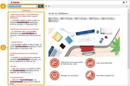 Saisissez un ou plusieurs mots-clés et cliquez sur  pour afficher les résultats de la recherche. Vous pouvez rechercher les pages contenant tous les mots-clés en séparant les mots-clés par un espace. Vous pouvez également ne rechercher que les pages contenant une certaine phrase en mettant les mots-clés constituant cette phrase entre guillemets.
