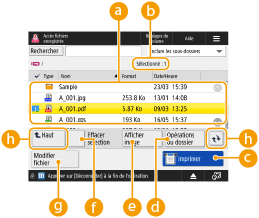 Fichiers et dossiers sauvegardésIndique si les fichiers ou dossiers sont sélectionnés, affiche les icônes signalant le type de fichier ou le dossier, les noms, les formats de fichier et les dates et heures d'enregistrement.