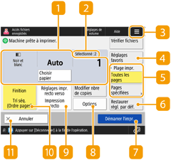 Lorsque vous appuyez sur <Accès aux fichiers enregistrés> dans l’écran <Accueil>, puis sur <Réseau> ou <Support mémoire> pour imprimer des fichiers, l'écran de réglage suivant s'affiche.