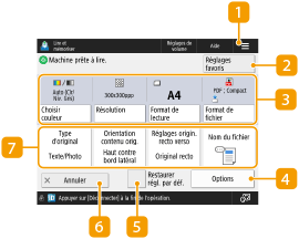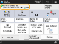 Lorsque vous appuyez sur <Lire et mémoriser> dans l’écran <Accueil>, puis sur <Réseau> ou <Support mémoire> pour numériser des originaux, l'écran de réglage suivant s'affiche.