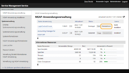 1 | Klicken Sie auf [MEAP-Anwendungsverwaltung] [Deinstallieren] für die zu deinstallierende Anwendung.![]() |