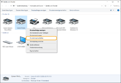 Rechtsklicken Sie auf das Druckersymbol des Geräts, und klicken Sie dann auf [Druckereigenschaften].