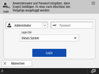 Wenn der Anmeldebildschirm angezeigt wird, müssen sich autorisierte Benutzer zur weiteren Verwendung des Geräts anmelden. Um sich anzumelden, muss jeder Benutzer seinen Benutzernamen und sein Passwort eingeben. Damit wird die Sicherheit des Geräts sichergestellt. Außerdem können die Benutzer das Gerät auf diese Art so bequem wie möglich verwenden, da sie die Anzeige und die Einstellungen nach ihren Wünschen anpassen (personalisieren) können. Die auf dem Anmeldebildschirm angezeigten Elemente variieren je nach den Benutzerverwaltungseinstellungen. Führen sie die Anmeldung unter Beachtung der angezeigten Elemente durch.