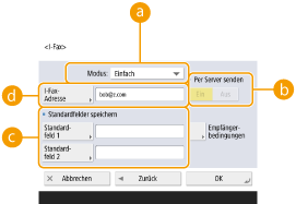 1 | Legen Sie Einstellungen nach Bedarf fest. ![]() <Modus:>Sie können den Typ der Sendeergebnisse auswählen, die angezeigt werden, wenn (Statusmonitor) gedrückt wird. Wählen Sie <Voll>, wenn Sie prüfen möchten, ob ein I-Fax an das Gerät des Empfängers zugestellt wird, oder wählen Sie <Einfach>, wenn Sie prüfen möchten, ob ein I-Fax an einen Mailserver zugestellt wird. Beachten Sie, dass Sie den Zustellungsstatus nicht überprüfen können, wenn das Gerät des Empfängers die Funktion <Modus:> nicht unterstützt.![]() Wenn Sie ein I-Fax im Modus <Voll> an ein Gerät senden, das den Modus <Voll> nicht unterstützt, wird selbst nach abgeschlossener Übertragung <Auf Ergeb. warten...> angezeigt, wenn Sie den Zustellungsstatus durch Drücken von (Statusmonitor) überprüfen. Diese Meldung wird angezeigt, bis die in <SE Timeout für Vollmodus> festgelegte Zeit vergangen ist.Sie können den Status der Zustellung überprüfen, indem Sie (Statusmonitor) <Senden> <Auftragslog> drücken. Wenn das Dokument erfolgreich gesendet wurde, wird <OK> angezeigt, wenn es nicht gesendet werden konnte, wird <NG> angezeigt, und wenn das Ergebnis nicht überprüft werden kann, wird <--> angezeigt. Im einfachen Modus ist die Zustellbestätigung deaktiviert, und es wird <--> auch bei einer erfolgreichen Zustellung angezeigt. <Per Server senden>Legen Sie fest, ob I-Faxnachrichten über den Mailserver gesendet werden sollen. Wählen Sie <Ein>, wenn Sie I-Faxe über den Mailserver senden möchten. Wählen Sie <Aus>, wenn Sie Daten direkt an einen Empfänger in demselben LAN senden möchten. Durch das direkte Senden an einen Empfänger können Sie große Datenmengen senden, ohne den Mailserver zu belasten. ![]() Um ein I-Fax, das kein IP-Adressformat wie beispielsweise "Benutzername@[IP-Adresse des Empfängers]" aufweist, ohne Verwendung eines Mailservers zu senden, müssen Einstellungen wie beispielsweise ein MX (Mail eXchange)-Eintrag auf dem DNS-Server konfiguriert sein. Fragen Sie den Netzwerkadministrator, ob diese Art von Einstellung verfügbar ist. Wenn Sie <Aus> unter <Per Server senden> einstellen, müssen Sie zuvor <Ein> unter <Per Server senden verwenden> einstellen. Wenn diese Einstellung auf <Aus> gesetzt ist, kann die Einstellung unter <Per Server senden> nicht geändert werden. Es wird empfohlen, <MDN nicht per Server zulassen> auf <Ein> zu setzen. Auch wenn Sie <Per Server senden> auf <Aus> einstellen, wird die Rückmeldung für Dokumente, die im Vollmodus gesendet wurden, über den Server vorgenommen. <Standardfelder speichern>Diese Einstellung ist für die Verwendung eines Internetfaxdienstes erforderlich. Wenn Sie keinen Internetfaxdienst verwenden, ist diese Einstellung nicht erforderlich. Weitere Informationen dazu erhalten Sie bei Ihrem Internetanbieter. <I-Fax-Adresse>Geben Sie die I-Fax-Adressen im folgenden Format ein: adv01@example.com. Verwenden Sie beim Senden an einen Empfänger in demselben Netzwerk das folgende Format: adv01@[192.168.11.100] (Gerätename des Empfängers@[IP-Adresse]). Wenn die zu verwendende Domäne fest eingestellt ist, können Sie die Domäneneingabe überspringen. Sie können einen Domänennamen in <Def. Domän auto. an Empf.ohne Domän hinzufügen> registrieren und <Bei Senden eines I-Fax> im Voraus aktivieren, um beim Senden automatisch eine Domäne hinzuzufügen, ohne dass Sie "@" und den Domänennamen eingeben müssen. Sie können häufig verwendete Domänennamen unter <Gespeicherte Zeichen> auf der Tastatur speichern und sie erneut aufrufen, wenn Sie eine I-Faxadresse eingeben. <Gespeicherte Zeichen für Tastatur> |