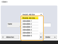 Mehrere Ziele, die im Adressbuch registriert sind, können in einer Gruppe zusammengefasst werden. Ausführliche Informationen finden Sie unter Registrieren mehrerer Empfänger als Gruppe. Informationen zum Ändern oder Löschen der Informationen von im Adressbuch registrierten Zielen finden Sie unter Bearbeiten der im Adressbuch registrierten Empfänger. UPN kann nur zum Senden an einen Computer verwendet werden, der zu einer Domain gehört, die mit einem aktiven Verzeichnis betrieben wird. |