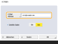 2 | Wählen Sie in <Geteilte Daten> <Ein> oder <Aus>. Wenn die gesendete Datenmenge den Höchstwert überschreitet (<Maximale Datengröße zum Senden>), legen Sie fest, ob die Daten nach Größe oder nach Seite aufgeteilt werden sollen. Wenn Sie <Ein> auswählen, werden die Daten in kleinere Mengen aufgeteilt, die unter dem Grenzwert liegen, und in mehreren Teilen gesendet. Die E-Mail-Software des Empfängers muss in der Lage sein, die empfangenen Daten zu kombinieren. Wenn Sie <Aus> auswählen, wird die jeweils zu sendende Anzahl Seiten verringert und die Gesamtübertragung in mehrere Teile aufgeteilt. 10 Seiten mit Daten werden beispielsweise in zwei Vorgängen mit jeweils 5 Seiten übertragen. Daher erhält der Empfänger zwei E-Mails. Wenn Sie allerdings Daten senden, die nicht in Seiten aufgeteilt werden können, wie z. B. JEPG, tritt ein Übertragungsfehler auf. ![]() Wenn die zu verwendende Domäne fest eingestellt ist, können Sie die Domäneneingabe überspringen. Sie können einen Domänennamen in <Def. Domän auto. an Empf.ohne Domän hinzufügen> registrieren und <Bei Senden einer E-Mail> im Voraus aktivieren, um beim Senden automatisch eine Domäne hinzuzufügen, ohne dass Sie "@" und den Domänennamen eingeben müssen. Sie können häufig verwendete Domänennamen unter <Gespeicherte Zeichen> auf der Tastatur speichern und sie erneut aufrufen, wenn Sie eine E-Mail-Adresse eingeben. <Gespeicherte Zeichen für Tastatur> |