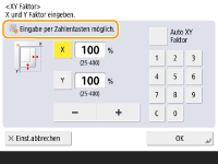 Wenn das Zahlentastensymbol angezeigt wirdWenn < Eing. per Zahlentasten mögl.> angezeigt wird, können Sie Zahlenwerte über die Zahlentasten rechts auf dem Sensordisplay eingeben.Beispiel: Einstellbildschirm <XY Faktor> ![]() Wenn < Mit Zahlentasten eingeben.> angezeigt wird, können nur die Zahlentasten rechts auf dem Sensordisplay zur Eingabe von Zahlen verwendet werden.Zeichen über die USB-Tastatur eingebenZur Eingabe von Zeichen können Sie auch eine USB-Tastatur verwenden, die an der USB-Buchse angeschlossen werden kann (Vorderseite). Beachten Sie bei der Eingabe über eine USB-Tastatur die folgenden Hinweise. Setzen Sie <MEAP-Treiber für USB-Eingabegerät verw.> unter <Einstellungen USB> auf <Aus>. <MEAP-Treiber für USB-Eingabegerät verw.> Sie können über eine USB-Tastatur nur ASCII-Zeichen eingeben. Tasten, die auf der Bildschirmtastatur des Sensordisplays nicht angezeigt werden, wie beispielsweise Löschen, Ende, Tab, Esc und Funktionstasten, können auf einer USB-Tastatur nicht verwendet werden. Die bei der Benutzung einer USB-Tastatur erzeugten Eingabetöne hängen von den Einstellungen in <Eingabeton> und <Fehlerhafte-Eingabe-Ton> auf dem Bildschirm für die Toneinstellung ab. Audioeinstellungen |