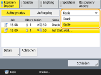 Wählen Sie in der Dropdown-Liste <Kopieren> aus, um Kopieraufträge in der Warteschlange anzuzeigen.