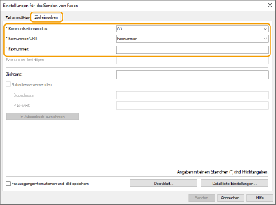 Klicken Sie auf die Registerkarte [Ziel eingeben], und geben Sie den Kommunikationsmodus und die Faxnummer an.