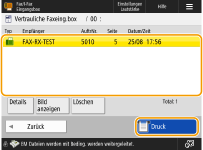 ![]() | Diese Funktion dient dazu, die empfangenen Dokumente, die bestimmten Bedingungen entsprechen, am festgelegten Speicherort (Vertrauliche Faxeingangsbox) zu speichern. Die Vertrauliche Faxeingangsbox enthält mehrere Boxen, und jede Box kann mithilfe eines Passworts geschützt werden. Durch die Festlegung einer Bedingung, wie das Speichern aller Dokumente der Firma A in Box Nr. 10, können Sie nur die von Ihnen benötigten Dokumente prüfen. Anhand dieser Funktion können Sie ebenfalls verhindern, dass unbefugte Personen unbeabsichtigt Einblick in vertrauliche Dokumente erhalten, indem Sie ein Passwort festlegen. Wenn die Anzeige Verarbeitung/Daten im Bedienfeld ständig grün leuchtet, gehen Sie wie folgt vor, um die gespeicherten Dokumente zu prüfen/drucken. |