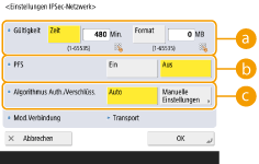 2 | Konfigurieren Sie die erforderlichen Einstellungen. ![]() <Gültigkeit>Legen Sie die Gültigkeitsdauer für die generierte IPSec SA fest. Achten Sie darauf, entweder <Zeit> oder <Format> festzulegen. Wenn Sie beides festlegen, wird die Einstellung mit dem zuerst erreichten Wert übernommen. <PFS>Wenn Sie die PFS-Funktion (Perfect Forward Secrecy) auf <Ein> festlegen, wird die Geheimhaltung des Verschlüsselungsschlüssels erhöht, jedoch die Kommunikationsgeschwindigkeit verlangsamt. Darüber hinaus muss die PFS-Funktion im Gerät des Kommunikationspartners aktiviert sein. <Algorithmus Auth./Verschlüss.>Wählen Sie entweder <Auto> oder <Manuelle Einstellungen> aus, um einzustellen, wie der Authentifizierungs- und Verschlüsselungsalgorithmus für die IKE Phase 2 festzulegen ist. Wenn Sie <Auto> auswählen, wird der ESP-Authentifizierungs- und -Verschlüsselungsalgorithmus automatisch eingestellt. Wenn Sie eine bestimmte Authentifizierungsmethode festlegen möchten, drücken Sie <Manuelle Einstellungen>, und wählen Sie eine der nachfolgenden Authentifizierungsmethoden aus.