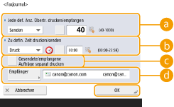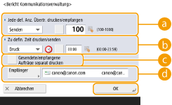 Bei Dokumenten, die per E-Mail gesendet wurden, gibt die Liste das Sendeergebnis zwischen dem Gerät und dem E-Mail-Server, nicht zwischen dem Gerät und dem Empfänger an. Wenn Sie <Ausgabedef. Anzahl Übertr.> in Schritt 3 auswählen, dann können Sie die Anzahl der Protokollergebnisse, die in der Liste eingeblendet werden, festlegen. Sie können festlegen, ob die Liste automatisch gedruckt werden soll. |