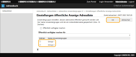 Sie können die Adresslisten der Benutzergruppe auch verwalten, indem Sie nur Benutzern mit Administratorrechten das Registrieren/Bearbeiten von Zielen über die Remote UI ermöglichen. <Adressliste Anwendergruppe verwenden>